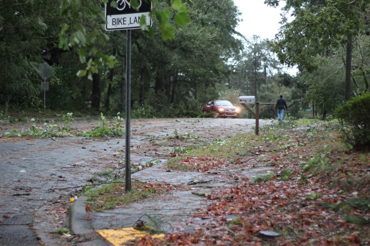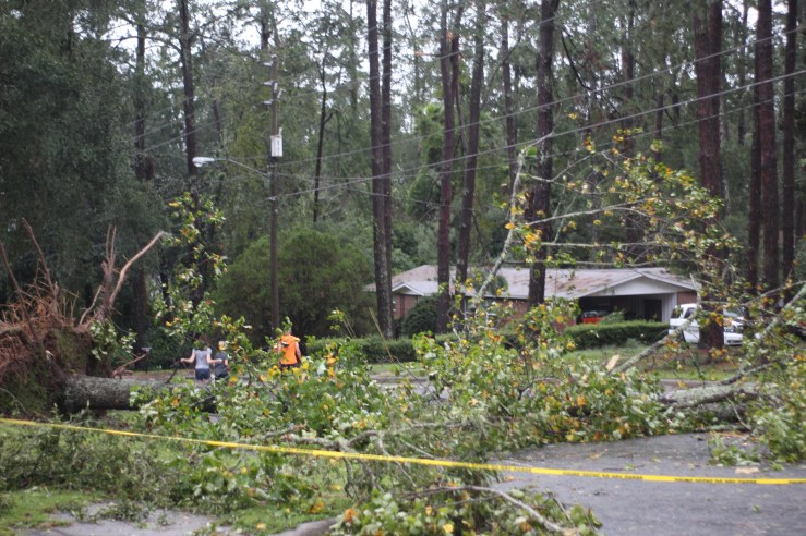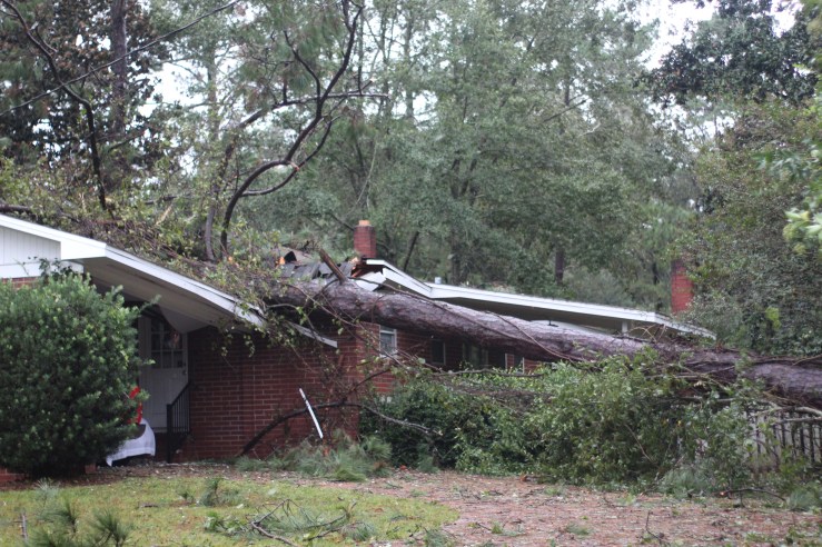 I’ve been back and forth across the panhandle on I-10 this weekend. The destruction, just from the interstate, is unbelievable. Forests along the road are barren of leaves, or flattened as though a malevolent giant swung an enormous dull axe across the landscape. The crowns of giant pine trees hang on precarious strips of bark alongside the trunks from which they were wrenched. Leaves and sawdust and other debris litter the shoulder. Signs have blown away. Billboards hang in tatters. What a mess.