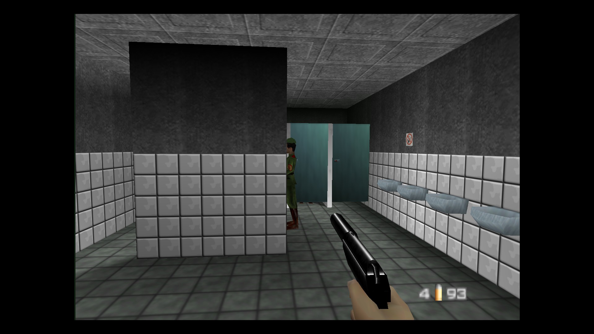 You enter the facility through an abnormally large air vent in the bathroom. The vent hangs open over an empty bathroom stall. You can see, in the next stall over, a young soldier in a garishly green uniform. You take aim at his head, probably not thinking about his neatly pressed garrison hat at all as you peer over the sights of your silenced handgun. You fire a single shot, killing the young man instantly. You drop—silently, ever so–into the stall below, careful not to slip on the toilet looming beneath the vent. You kick open the door, gun poised, and fire two more mercifully silent bullets tsk tsk into the body of another soldier regarding his reflection in the mirror. If you are skilled, he is dead before he even realizes you’ve entered the room. His body slowly disintegrates until nothing remains. One more soldier cowers in a stall across the room. You kick open the door, gun blazing, and he is gone.