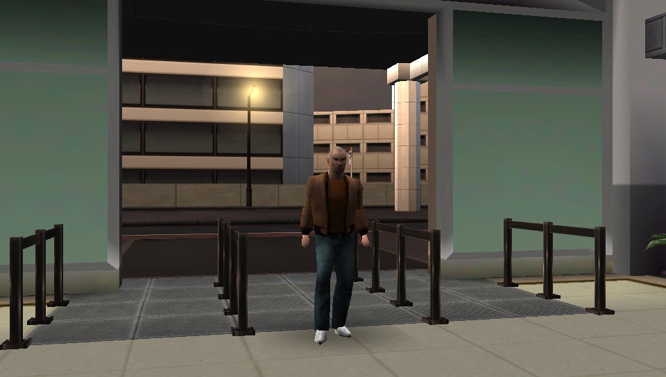 Consider these screenshots from the tutorial mission in Gangs of London (PSP – 2006). Set in the terminal and cargo areas of an airport, the mission guides players through a set of lobbies, corridors, warehouses, and city streets, teaching them the basics of gameplay along the way. In the first portion of the mission, the player is ushered through the terminal’s check-in area. Designed to support a large volume of people carrying luggage, in Gangs of London the space is eerily still and devoid of visitors.